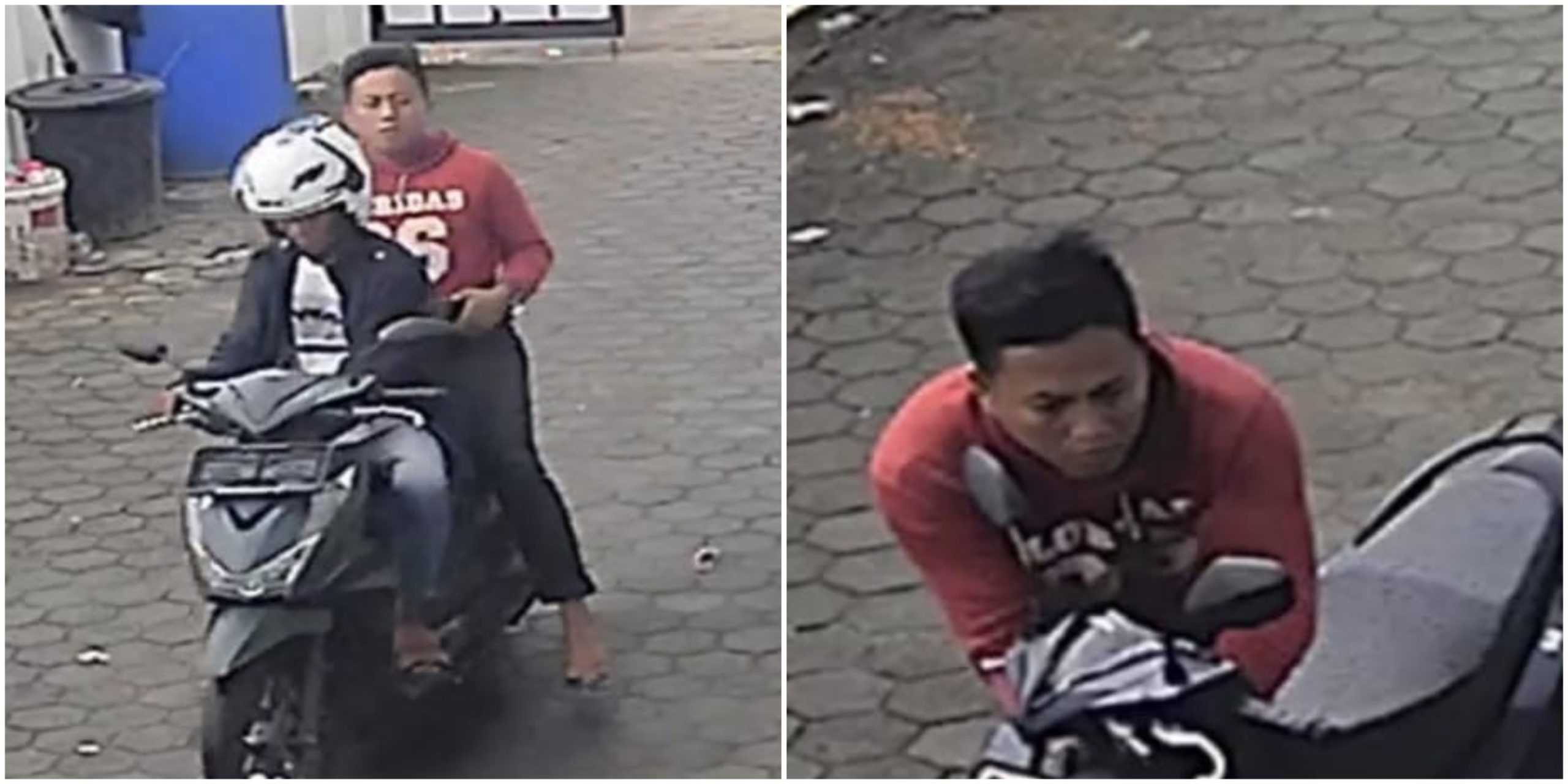 Pelaku yang berada di motor tampak mengenakan celana jeans biru, kaos putih yang dilapisi jaket hitam, serta menggunakan helm. Sementara pelaku eksekutor mengenakan celana hitam dan hoodie merah dengan tulisan “Floridas 96” di bagian depan, tanpa mengenakan helm.