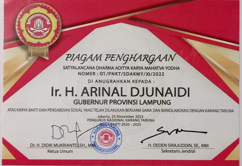 Berhasil Majukan Karang Taruna, Gubernur Lampung Peroleh Penghargaan Satyalancana Aditya Karya Mahatva Yodha