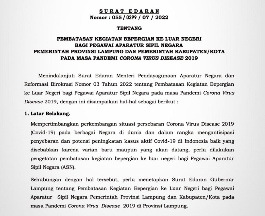 Cegah Omicron, Gubernur Lampung Terbitkan Edaran Larangan Bepergian Ke Luar Negeri Bagi ASN
