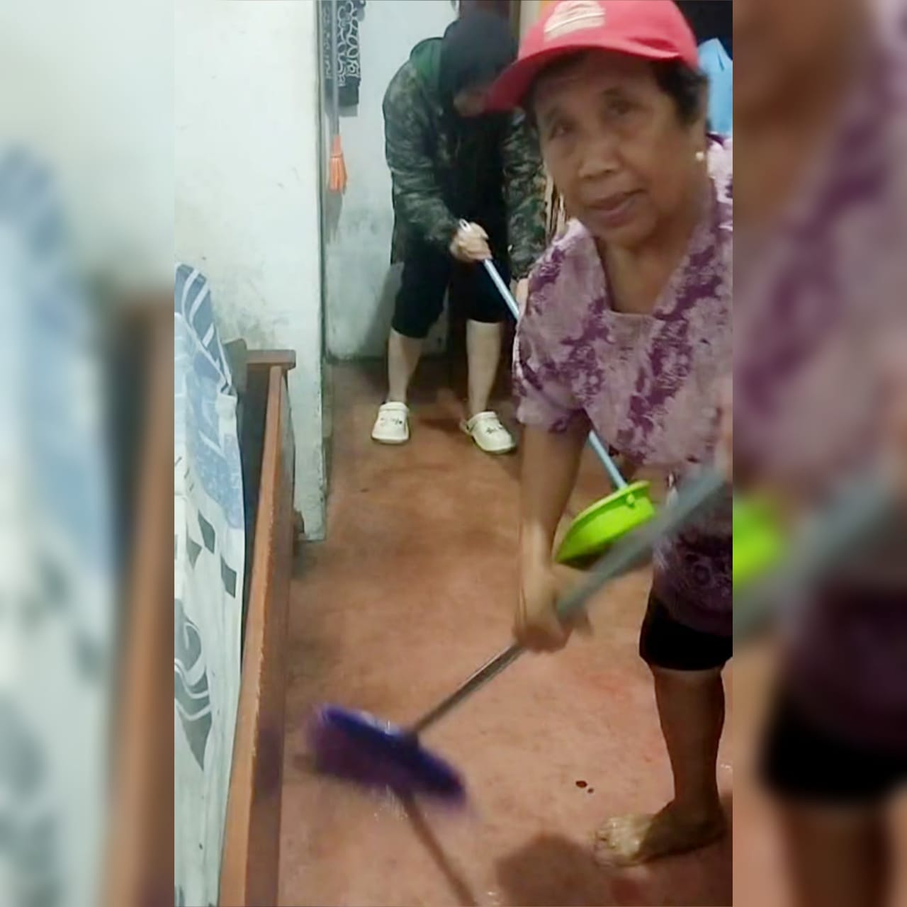 Camat Labuhan Ratu, Ny. Septia Isparina, S.Sos., M.M., bersama Lurah Labuhan Ratu, Sutarmin, Kepala Lingkungan II Eko Hadi Mario, S.E., serta Ketua RT 04 Bambang Supriadi, tampak ikut membantu warga dengan menimba air dari rumah-rumah yang terendam banjir.