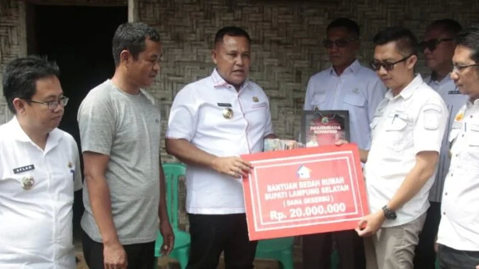 Bupati Lampung Selatan H. Nanang Ermanto memberikan bantuan bedah rumah kepada warganya yang kurang mampu, Rabu (13/3/2024).