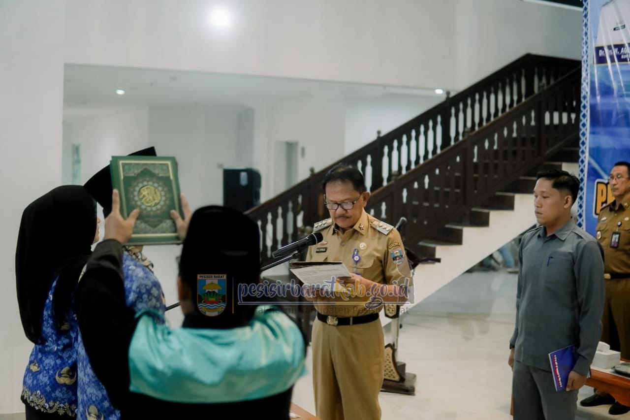 Gantanews.co – Bupati Pesisir Barat (Pesibar), Dr. Drs. Agus Istiqlal, S.H., M.H., menyerahkan secara simbolis petikan Surat Keputusan (SK) Bupati Pesibar tentang pengangkatan Pegawai Negeri Sipil (PNS) dan pengambilan sumpah/janji PNS, di Lobby Gedung A Lantai 1 Komplek Perkantoran Pemkab Pesibar, Senin (6/5/2024).