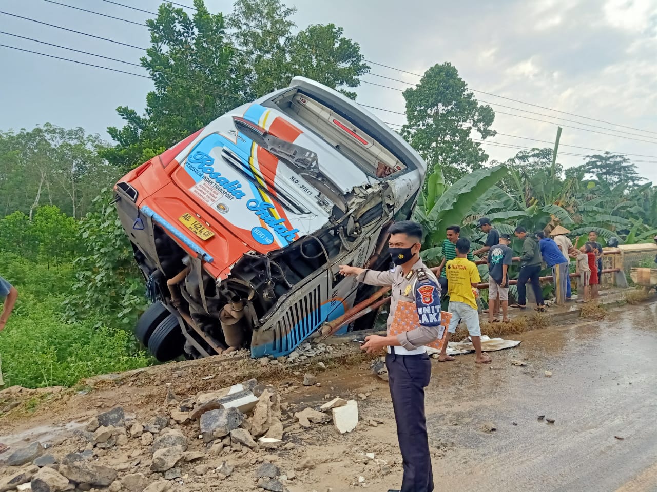 Gantanews.co, Mesuji – Jalan licin yang disebabkan hujan dan posisi jalan menikung lalu menurun, diduga menjadi penyebab kecelakaan bus Rosalia Indah dengan Nopol AD 1421 CU dan Truk bernopol Sumatera Utara (BK 9808 MO) di Jalan Lintas Timur KM 168-169, tepatnya di Jembatan Way Kilang Pemukiman Moro Seneng Register 45, Kecamatan Mesuji Timur, Selasa (27/04/2021).