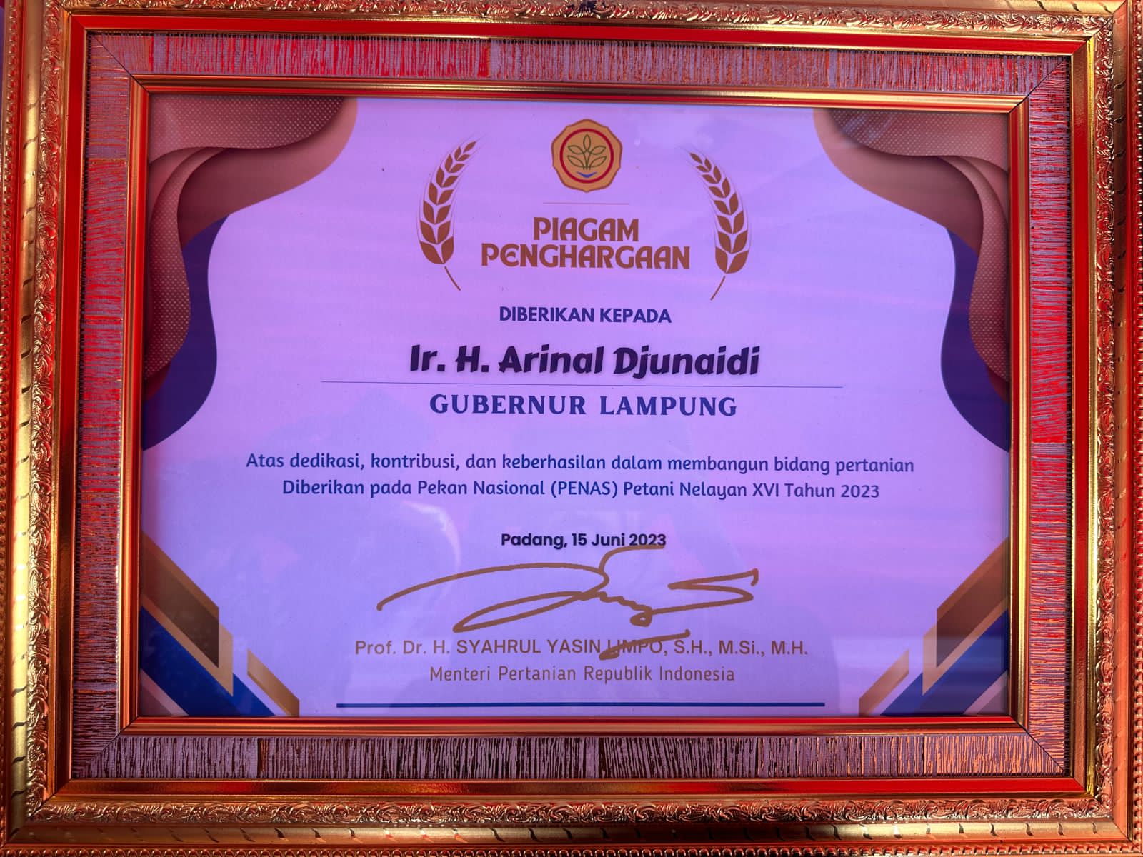 Dinilai Berdedikasi dalam Keberhasilan Pembangunan Pertanian, Gubernur Arinal Terima Penghargaan dari Mentan