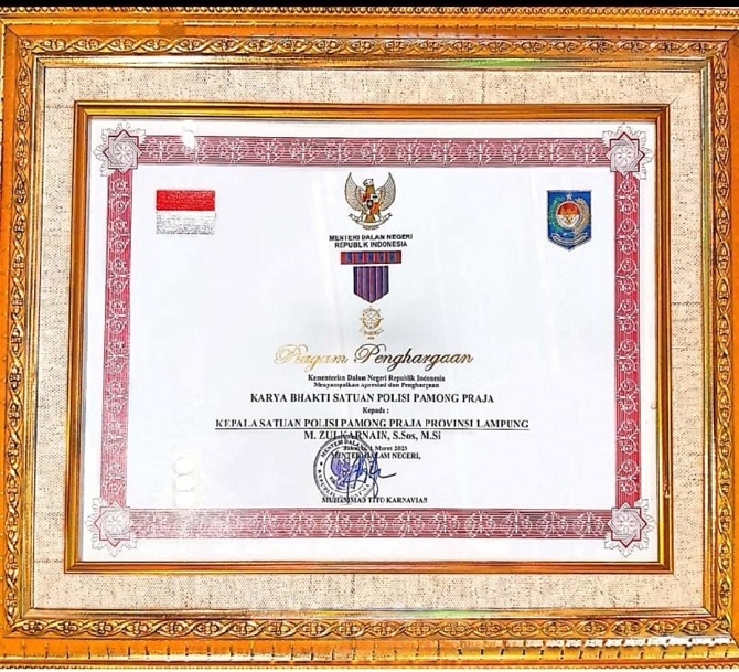 Kasat Pol PP Provinsi Lampung Terima Penghargaan atas Penilaian Keberhasilan Penyelenggaraan Trantibum dan Linmas