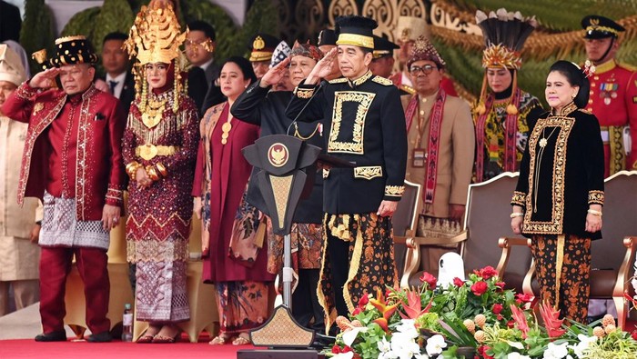 Dalam upacara yang khidmat ini, Presiden Jokowi tampil dengan mengenakan baju adat Kustim khas Kalimantan Timur. Pakaian ini terinspirasi dari warisan budaya Kesultanan Kutai Kertanegara, sebagaimana diinformasikan oleh Biro Pers Sekretariat Presiden. Penampilan Jokowi semakin mempertegas komitmen untuk menghormati dan melestarikan budaya lokal di setiap momentum kenegaraan.