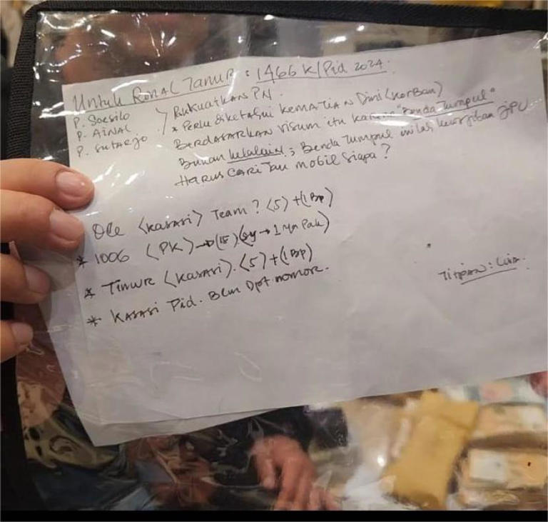 Dalam catatan tersebut, tertulis nama para hakim yang menangani kasasi dengan kode 1466K/Pid.2024, yang di antaranya ditandai dengan catatan “Pak Kuatkan PN,” merujuk pada permintaan untuk menguatkan vonis bebas dari Pengadilan Negeri (PN) Surabaya. Menariknya, catatan itu diberi label “Titipan Lisa,” yang diduga merujuk pada pengacara Ronald Tannur, Lisa Rahmat. Catatan tangan ini juga memuat instruksi kepada tim hukum untuk mengecek berbagai bukti terkait kematian korban Dini Sera Afriyanti, termasuk tanda-tanda yang menunjukkan adanya keterlibatan benda tumpul dalam kematiannya.