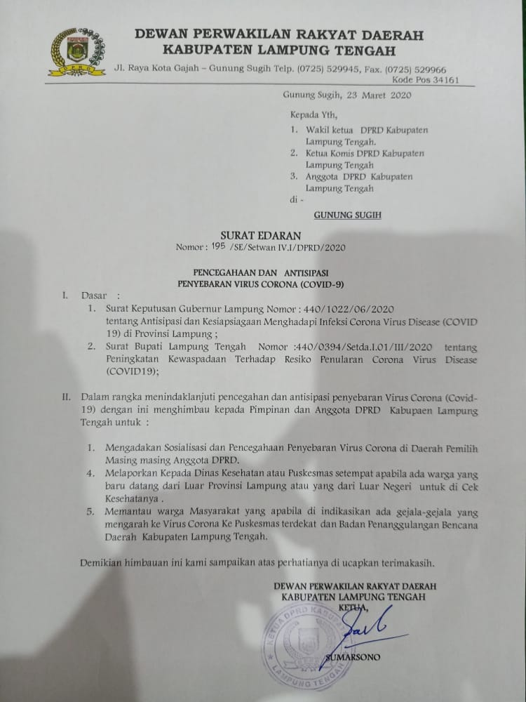 Lampung Tengah – DPRD Lampung Tengah mengeluarkan surat edaran dalam pencegahan dan antisipasi penyebaran virus corona virus. Surat edaran tersebut sebagai tindaklanjut imbauan Gubernur Lampung tentang antisipasi kesiapsiagaan menghadapi infeksi virus corona di Provinsi Lampung, dan surat edaran Bupati Lamteng tentang peningkatan kewaspadaan terhadap risiko penularan virus corona.
