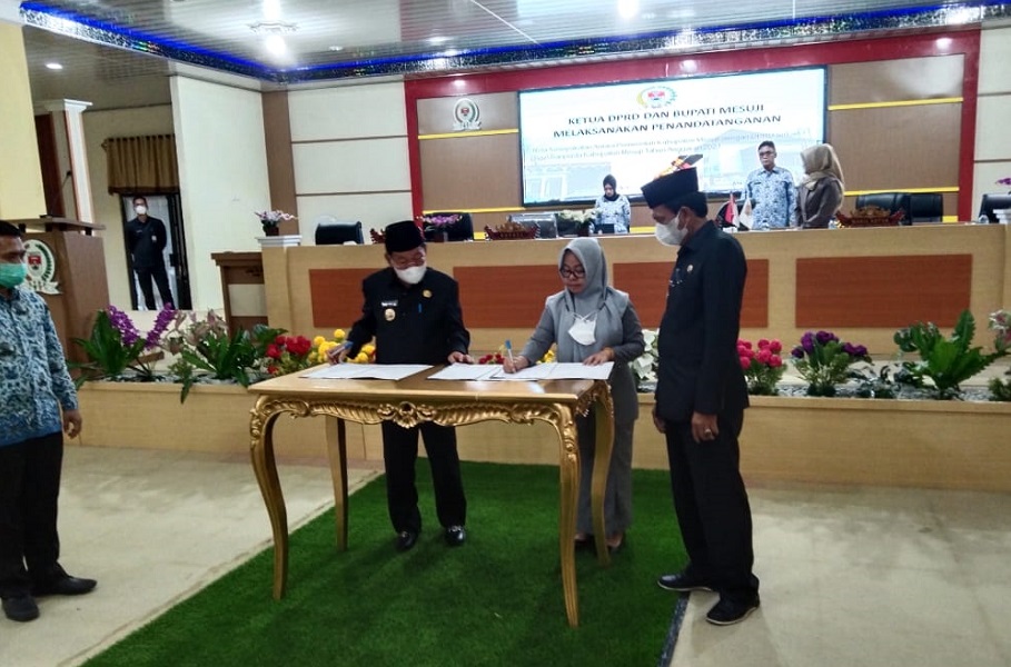 Penandatanganan Persetujuan Bersama Nota Kesepakatan antara Pemerintah Kabupaten Mesuji dengan DPRD terkait 3 (Tiga) Ranperda Kabupaten Mesuji Tahun Anggaran 2021 dilakukan oleh Ketua DPRD Kabupaten Mesuji dan Bupati Mesuji.