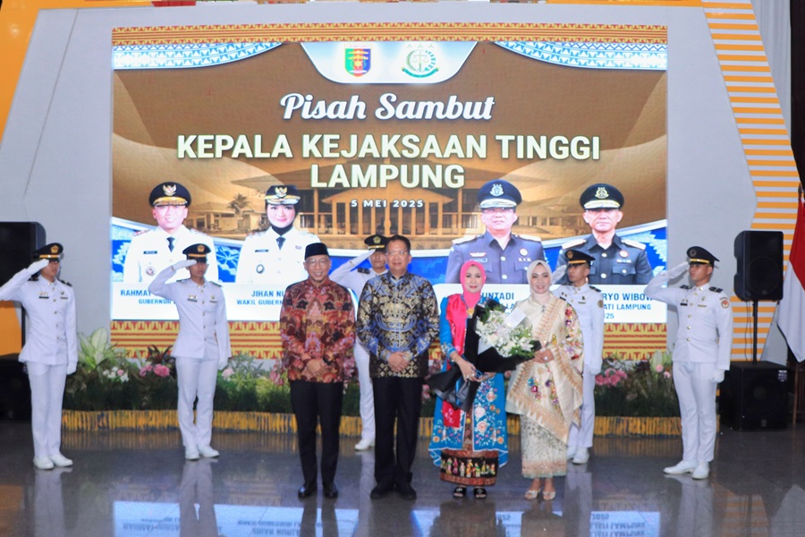 Gantanews.co — Gubernur Rahmat Mirzani Djausal didampingi Ketua TP PKK Provinsi Lampung Purnama Wulan Sari Mirza dan Wakil Gubernur Jihan Nurlela menggelar acara Pisah Sambut Kepala Kejaksaan Tinggi Lampung, di Mahan Agung, Senin(5/5/2025).