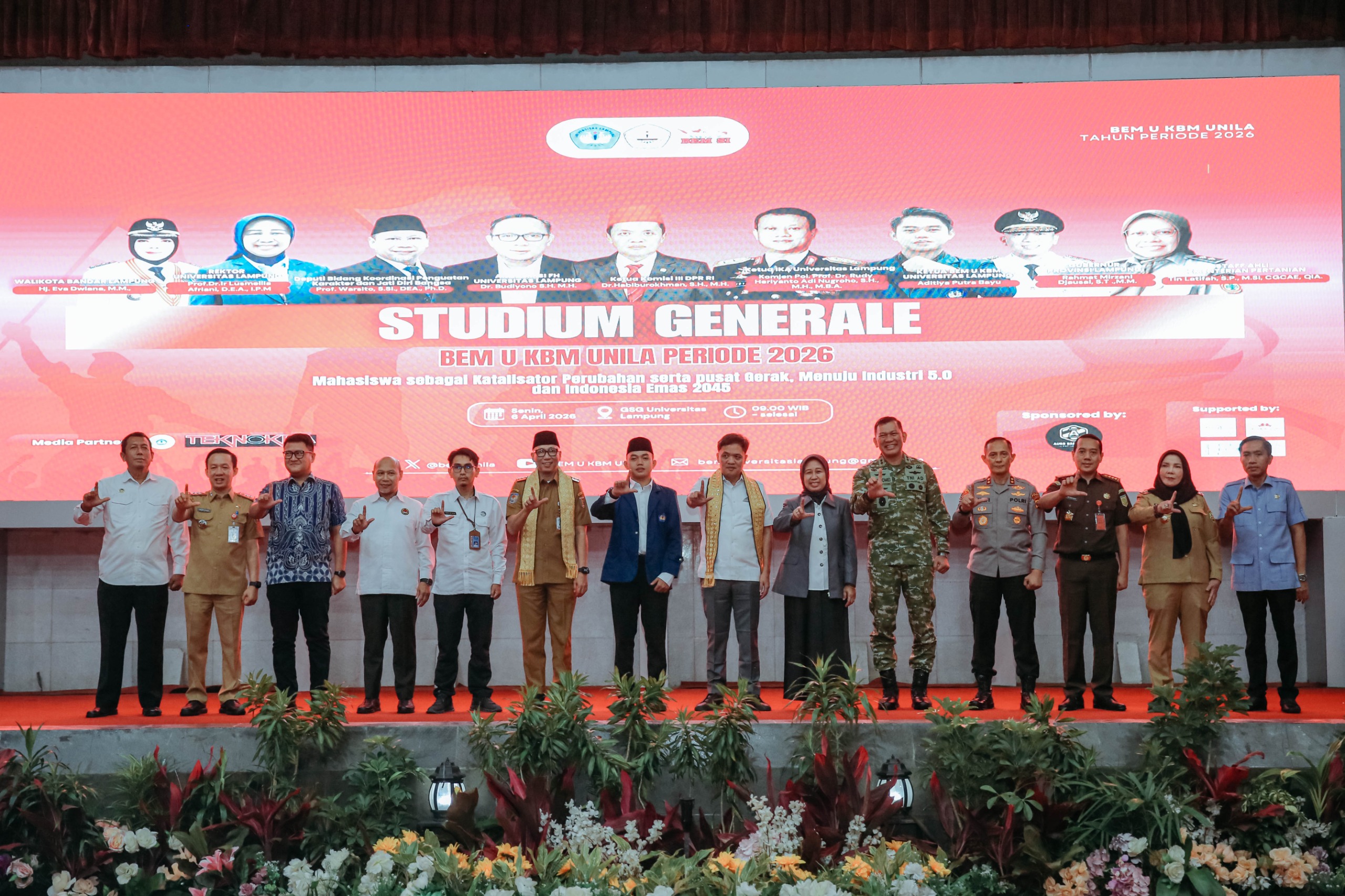 Gantanews.co – Gubernur Lampung Rahmat Mirzani Djausal menghadiri Acara Stadium General dan Pelantikan Pengurus BEM U KBM Universitas Lampung (Unila) periode 2026 yang digelar di Gedung Serbaguna (GSG) Unila, Senin (6/4/2026). Acara ini turut dihadiri oleh Ketua Komisi III DPR RI, Dr. Habiburokhman, S.H., M.H., serta jajaran Forum Komunikasi Pimpinan Daerah (Forkopimda).