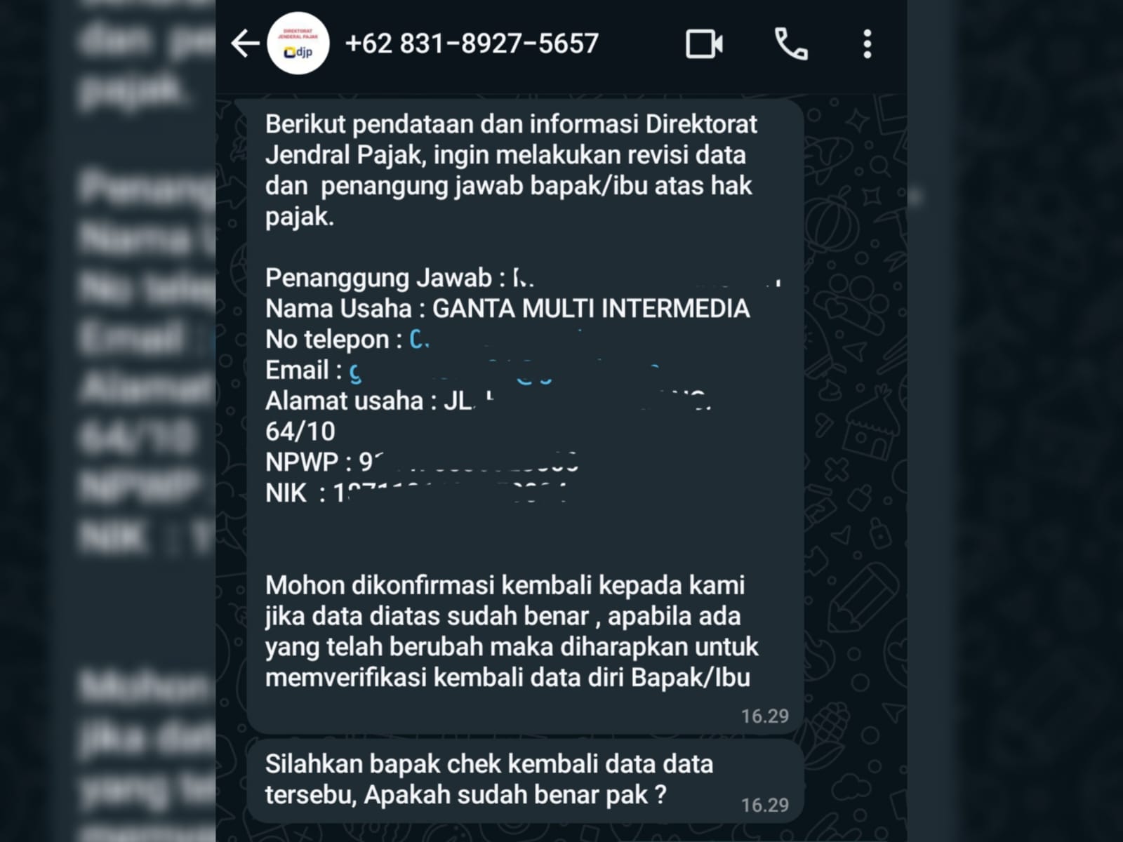 Modus ini dimulai dengan pesan WhatsApp yang diterima dari nomor 0831-8927-5657. Pesan tersebut berisi permintaan verifikasi data Nomor Pokok Wajib Pajak (NPWP) perusahaan kami. Karena pesan tersebut tidak kami tanggapi, pelaku penipuan mencoba menghubungi kami melalui panggilan telepon untuk mengkonfirmasi apakah nomor kami merupakan nomor yang terdaftar saat pendaftaran NPWP.
