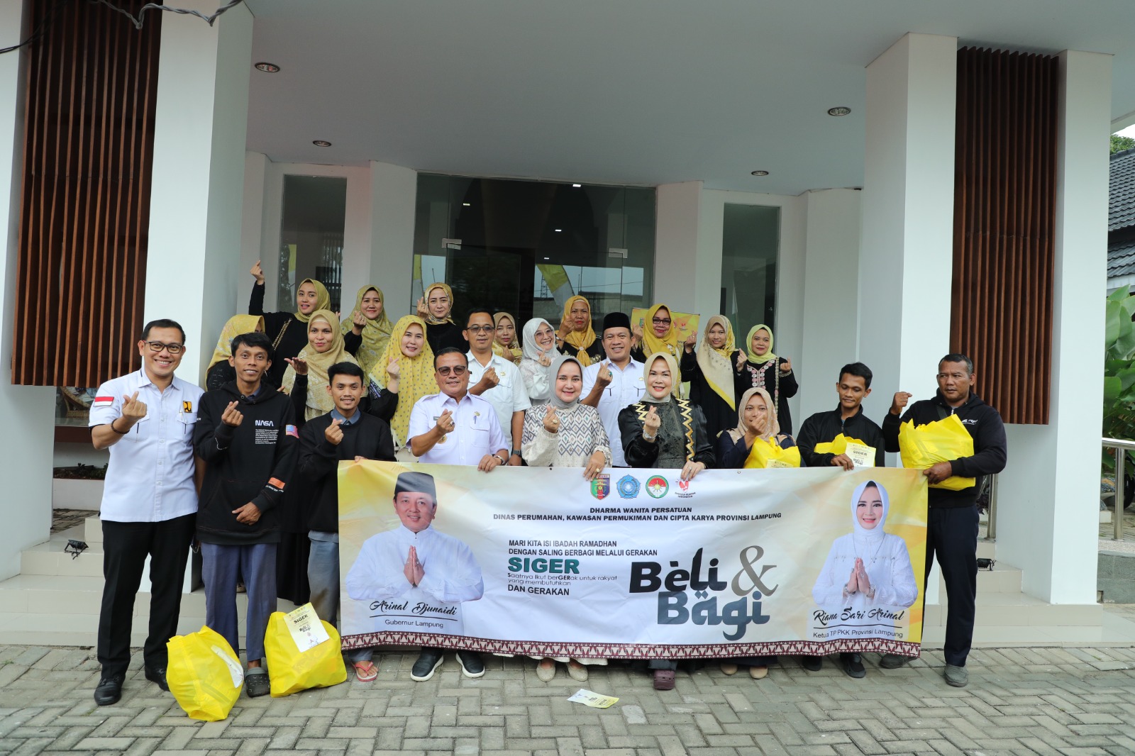 Ibu Riana Sari Arinal bersama Dharma Wanita Persatuan BPSDM dan Disperkim Cipta Karya Provinsi Lampung Gelar Gerakan “Beli dan Bagi” di Halaman Dekranasda Lampung