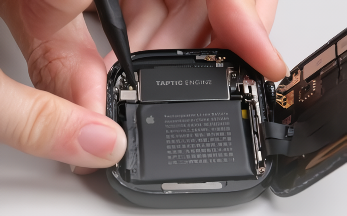 Untuk membongkar perangkat ini, pengguna harus membuka celah yang sangat kecil, hanya 0,176 mm, dan terus mencongkel sambil memanaskan perangkat terlebih dahulu. Setelah berhasil dibuka, terlihat baterai dengan kapasitas 327 mAh dan mesin Taptic yang ukurannya cukup besar, bahkan mencapai sepertiga dari ukuran baterai.