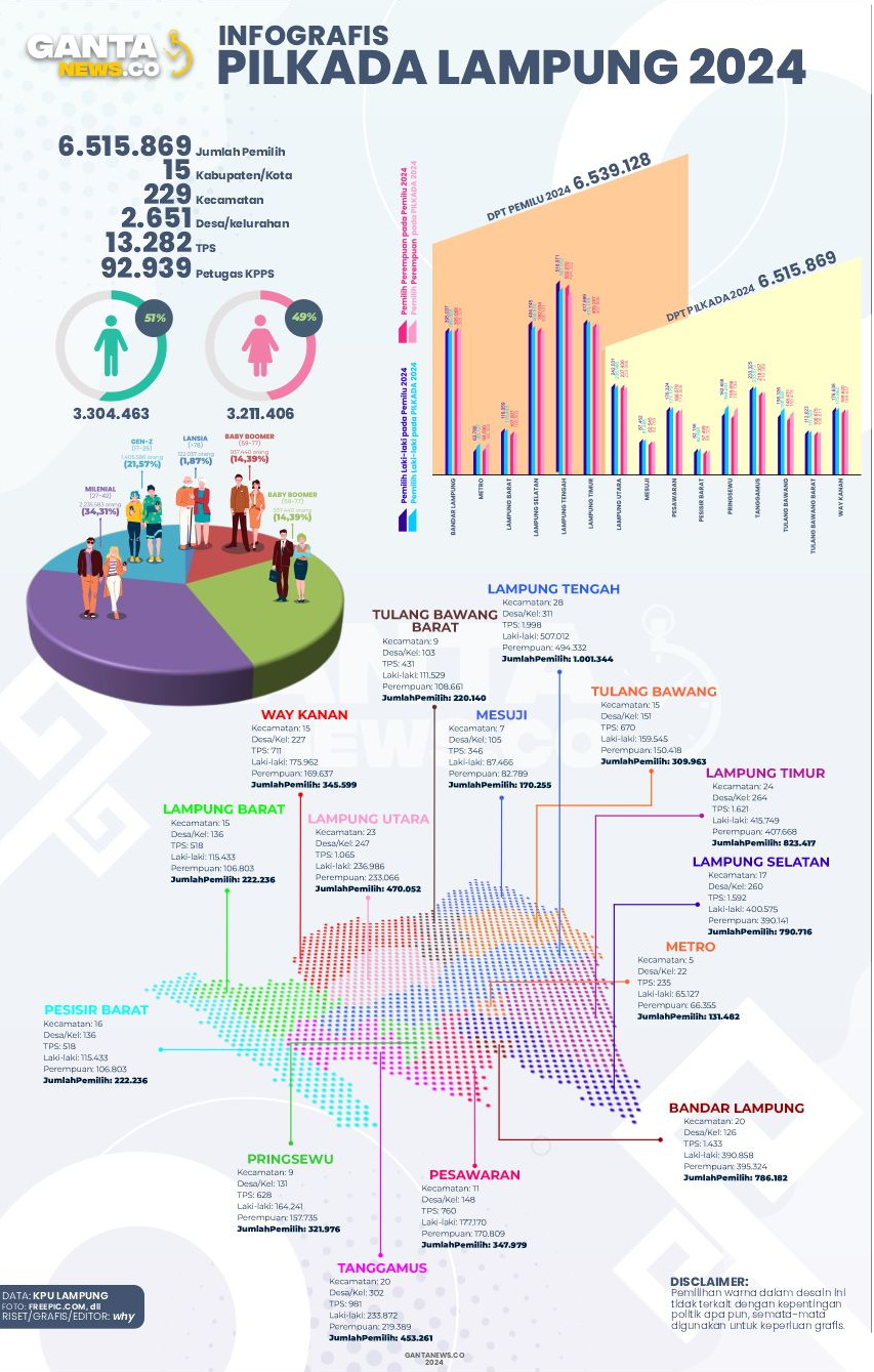Secara demografis, pemilih didominasi oleh generasi milenial dan Gen Z, yang mencapai hampir 60% dari total pemilih. Infografis ini juga menunjukkan rincian jumlah pemilih di tiap daerah, seperti Lampung Tengah dengan 1.001.344 pemilih dan Bandar Lampung dengan 735.772 pemilih. Data ini dapat menjadi acuan penting dalam memantau kesiapan Pilkada Lampung 2024. (red)