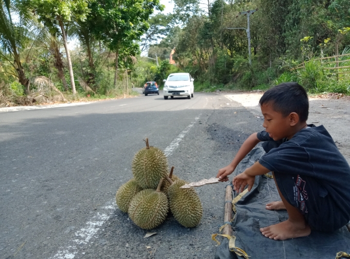 Pedagang lainnya, Rido Aditia (10) mengungkapkan, orangtuanya menjaga kebun sambil menunggu durian jatuh karena sedang musim panen. Lalu, ia dan sepupunya yang menjual.
