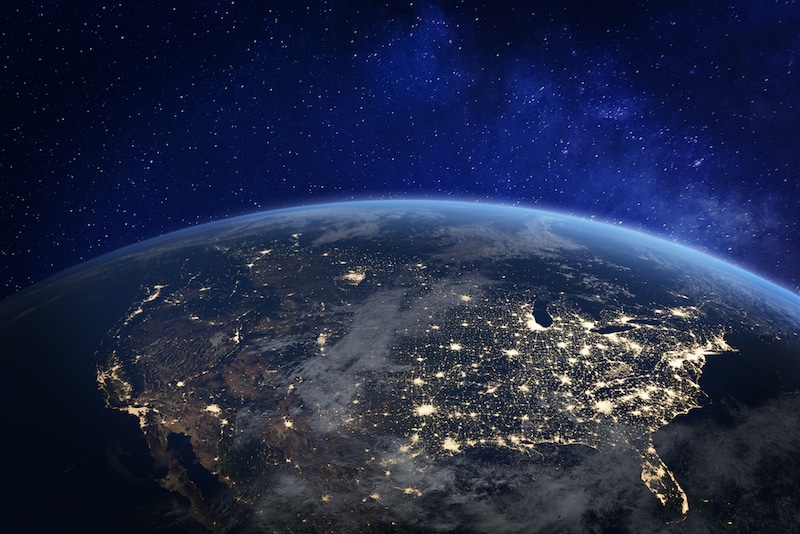North America at night viewed from space with city lights showing human activity in United States (USA), Canada and Mexico, New York, California, 3d rendering of planet Earth, elements from NASA