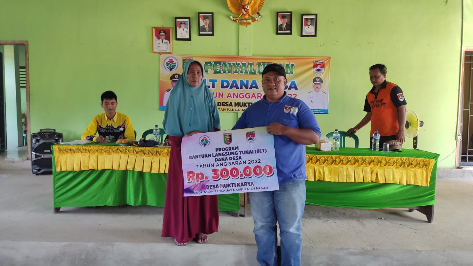 Bantuan Langsung Tunai itu dibagikan di Balai Desa Mukti Karya, Jumat (01/07/22). Uang Rp900 ribu merupakan hak mereka ntuk 3 bulan (April, Mei, Juni). Tiap bulan Rp300.000 dan Insya Allah akan cair lagi pada September nanti.
