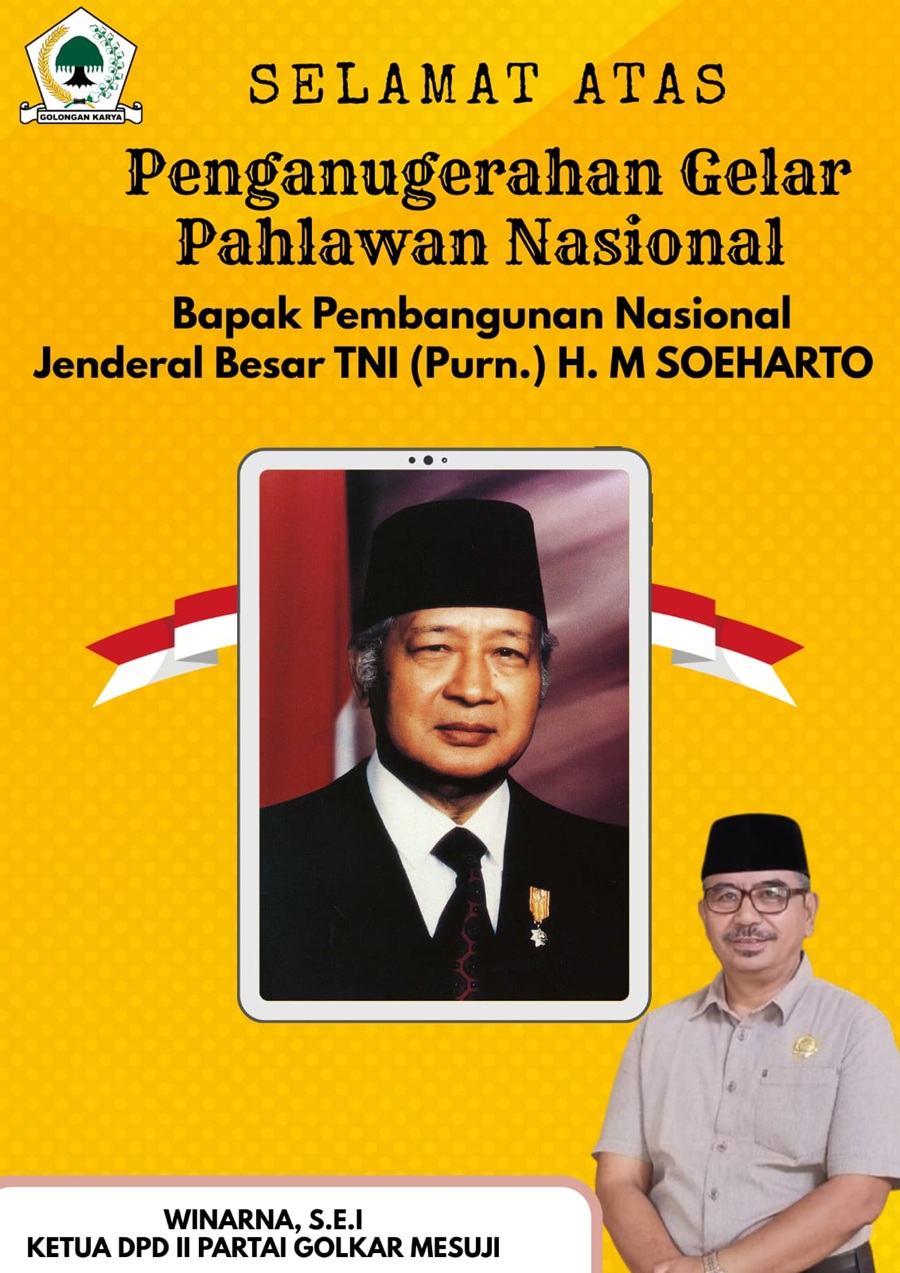 “Atas nama Partai Golkar Kabupaten Mesuji, Provinsi Lampung, saya mengucapkan terima kasih kepada Presiden Republik Indonesia Bapak Prabowo Subianto atas penganugerahan gelar kepada pendiri Partai Golkar, Jenderal (Purn) H. M. Soeharto,” ujarnya.