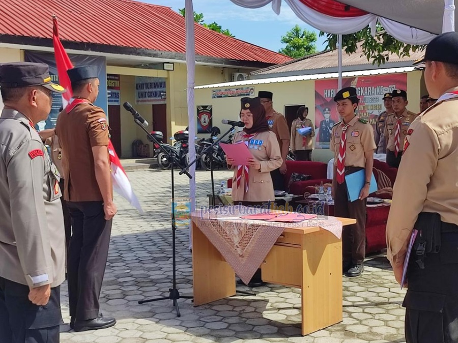 GANTANEWS.CO, PESISIR BARAT — Ketua Kwartir Cabang (Kwarcab) Gerakan Pramuka Kabupaten Pesisir Barat (Pesibar), Septi Istiqlal, melantik Satuan Karya (Saka) Bhayangkara Pesibar periode 2019-2024, di Mapolres Pesibar, Jumat (8/12/2023).