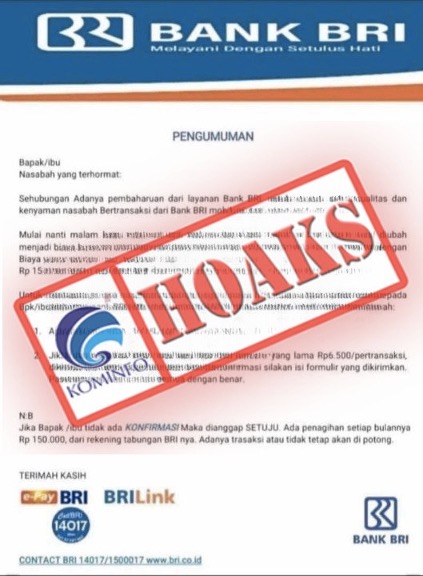 Setelah dilakukan penelusuran lebih lanjut, pihak BRI menegaskan bahwa mereka tidak pernah menawarkan bantuan senilai Rp500.000 untuk biaya sekolah anak. BRI juga mengingatkan masyarakat untuk berhati-hati terhadap informasi yang beredar di media sosial dan menegaskan bahwa semua informasi resmi dari BRI hanya akan disampaikan melalui situs web resmi dan akun media sosial terverifikasi.
