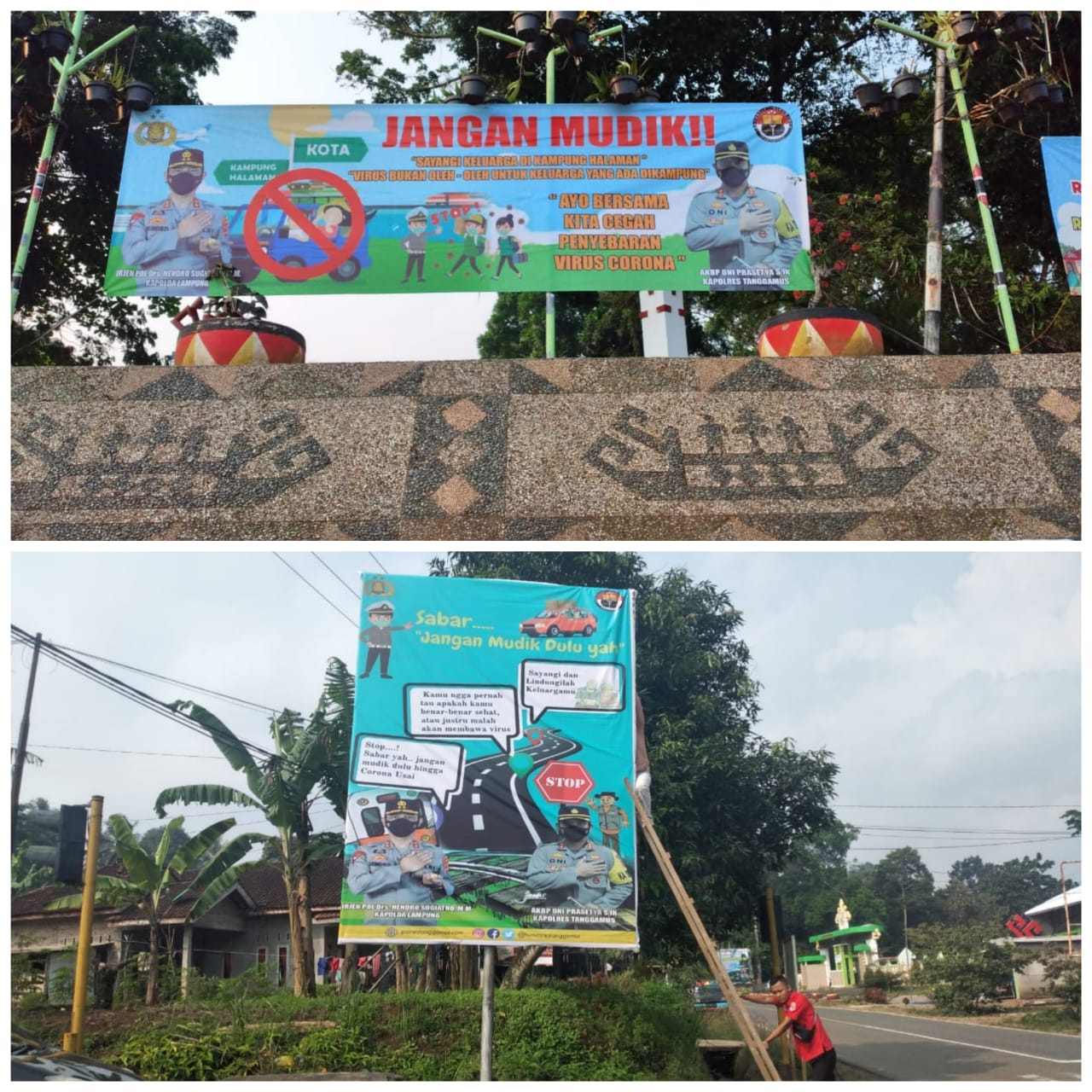 “Himbauan dipasang sebagai langkah mengingatkan kepada masyarakat, agar keluarga mereka tidak melakukan mudik atau pulang kampung. Demikian juga sebaliknya, sehingga cukup tinggal di rumah untuk sementara waktu,” kata Iptu M. Yusuf usai pemasangan.