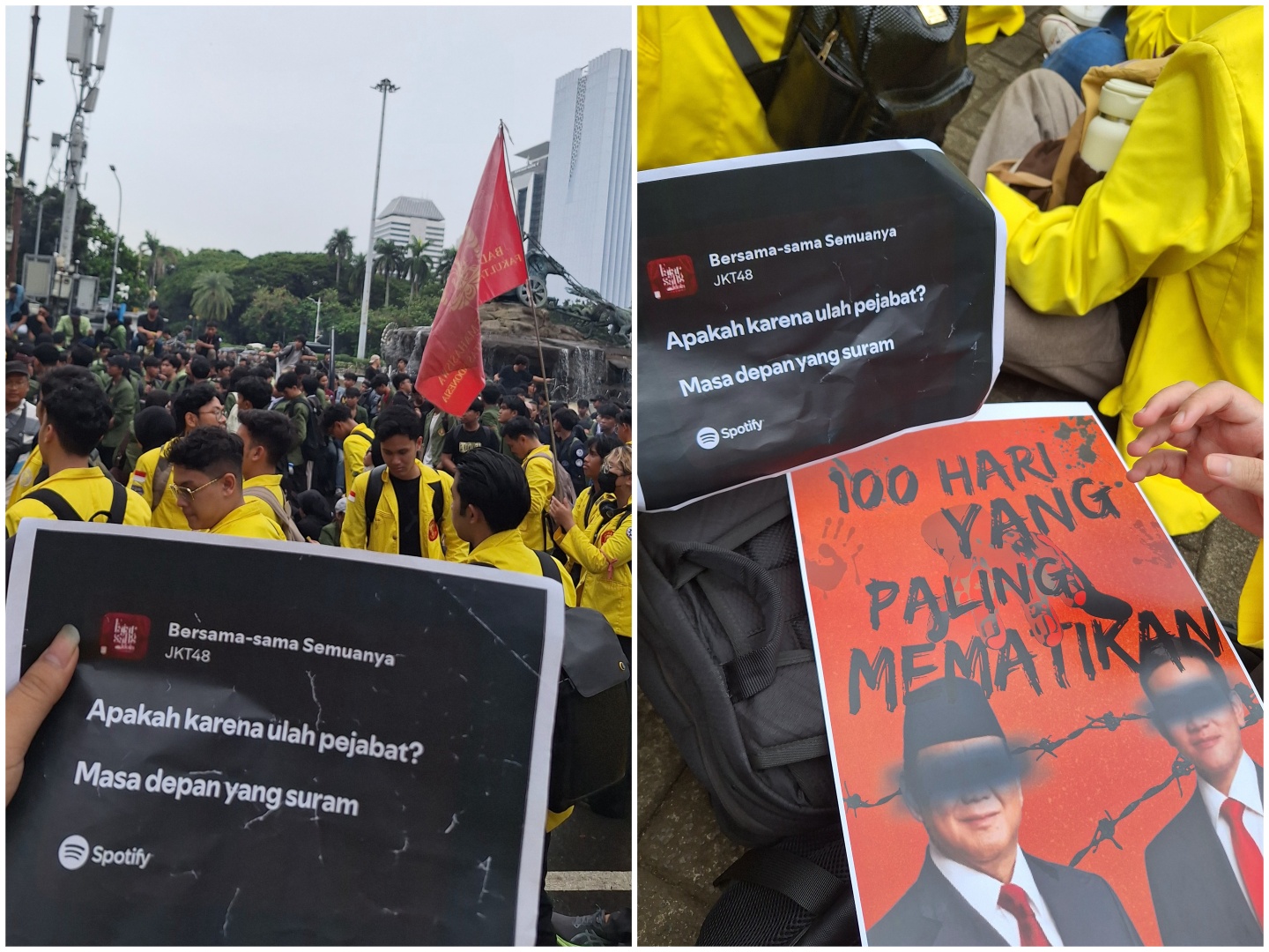 Foto yang diunggah oleh akun media sosial X @arynd_pra menunjukkan dua buah poster yang dibawa oleh demonstran. Salah satunya berisi kritik langsung terhadap Presiden Prabowo Subianto dan Wakil Presiden Gibran Rakabuming Raka, sementara poster lainnya menampilkan penggalan lirik lagu “Bersama-sama Semuanya”: