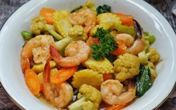 - Masukkan udang dan wortel, tumis beberapa saat. Lalu masukkan brokoli dan kembang kol, tumis sampai tercampur rata.