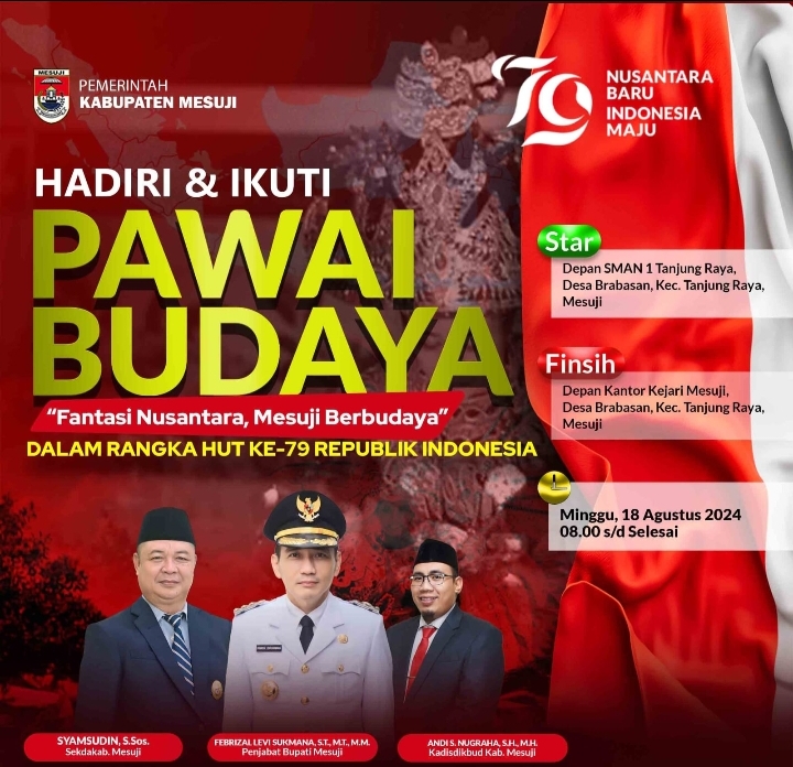 “Ayo, hadiri dan ikuti, serta daftarkan diri, untuk mengikuti Pawai Budaya dalam rangka memperingati HUT RI ke-79 Tahun 2024, di Bumi Ragab Begawe Caram,”Pungkasnya (Mintarso).