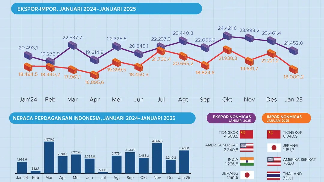 Gantanews.co – Badan Pusat Statistik (BPS) melaporkan bahwa neraca perdagangan Indonesia pada Januari 2025 mencatat surplus sebesar 3,45 miliar dolar AS. Surplus ini diperoleh dari selisih antara total ekspor yang mencapai 21,45 miliar dolar AS dan impor sebesar 18 miliar dolar AS dalam periode yang sama.