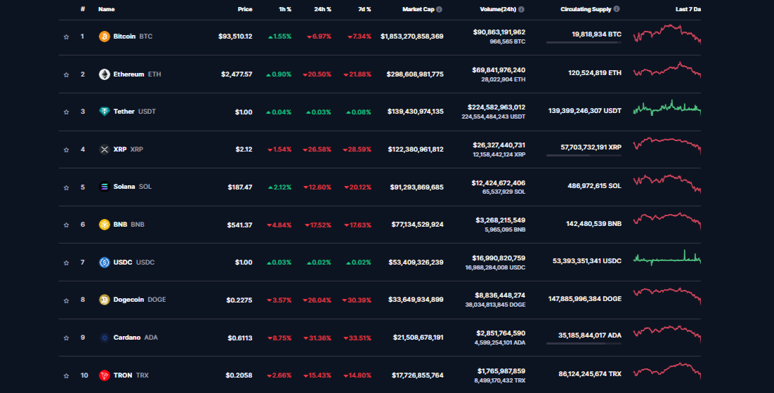 Berdasarkan data CoinMarketCap pukul 09:45 WIB, harga Bitcoin (BTC) turun 6,65% ke level US$93.868,66, sementara secara mingguan sudah melemah 7,23%.