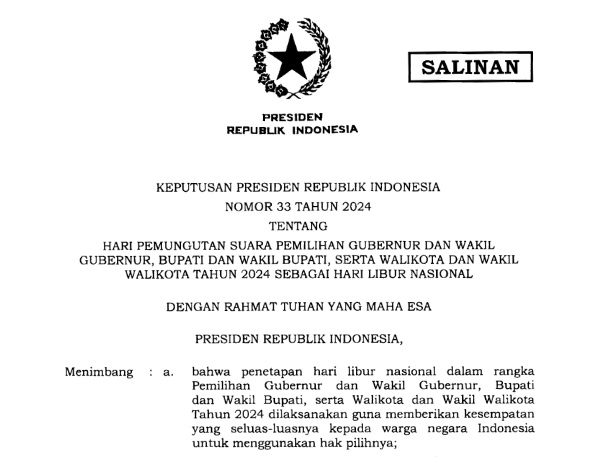 Isi lengkap Keppres Nomor 33 Tahun 2024 tentang Hari Pemungutan Suara Pilkada 2024 sebagai Hari Libur Nasional dapat disimak pada lampiran salinan Keppresnya dapat diunduh pada tautan ini