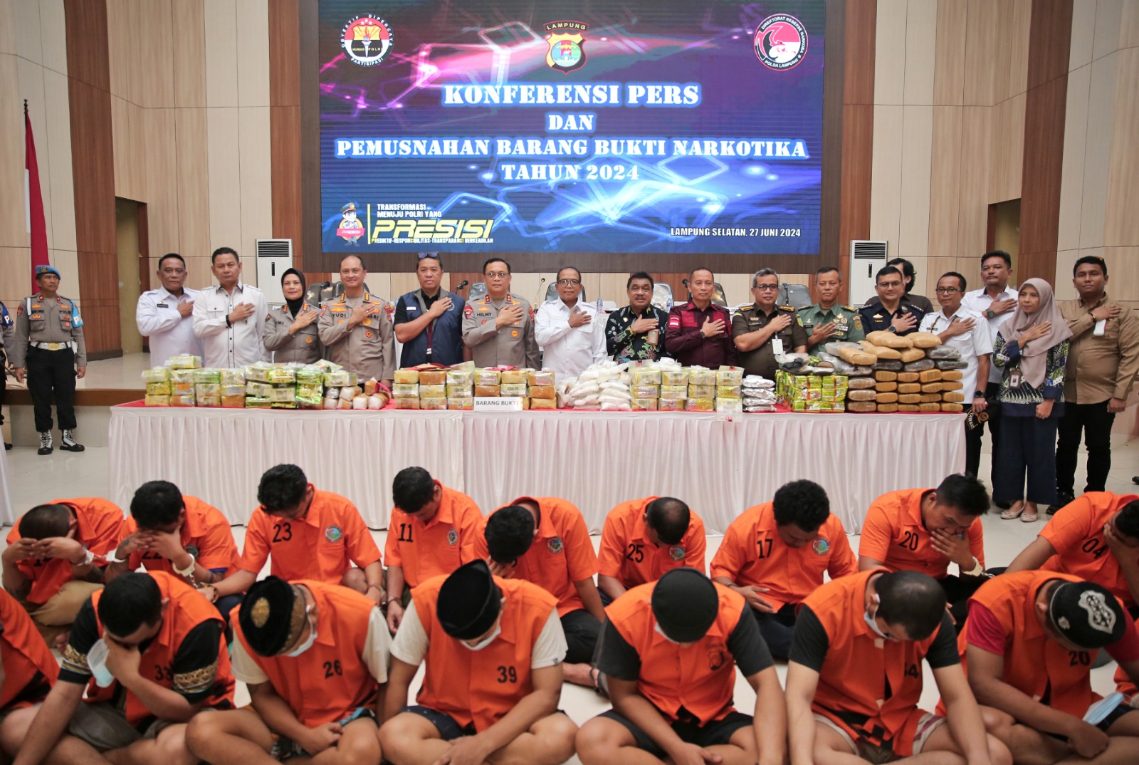 Gantanews.co – Pj. Gubernur Lampung Samsudin dan Kapolda Lampung Irjen Polisi Helmy Santika melakukan Pemusnahan Barang Bukti Narkotika Hasil Sitaan Polda Lampung Tahun 2024, yang dilaksanakan di Gedung Serba Guna Presisi, Mapolda Lampung, Lampung Selatan, Kamis (27/6/2024).