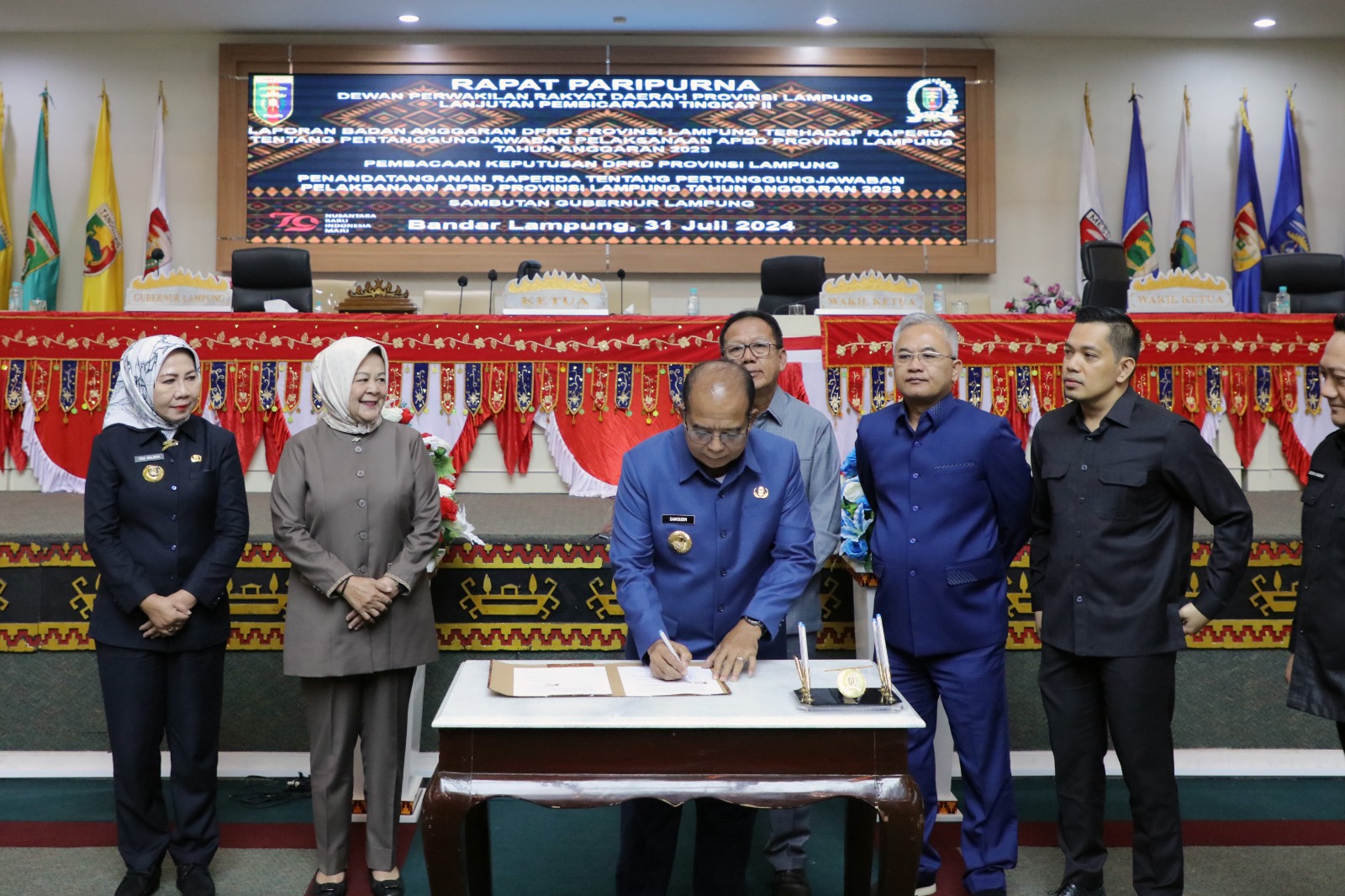 “Sehingga kita telah menghasilkan kesepakatan bersama terhadap Rancangan Peraturan Daerah tentang pertanggung-jawaban Pelaksanaan Anggaran Pendapatan dan Belanja Daerah Provinsi Lampung Tahun Anggaran 2023,” ujarnya.