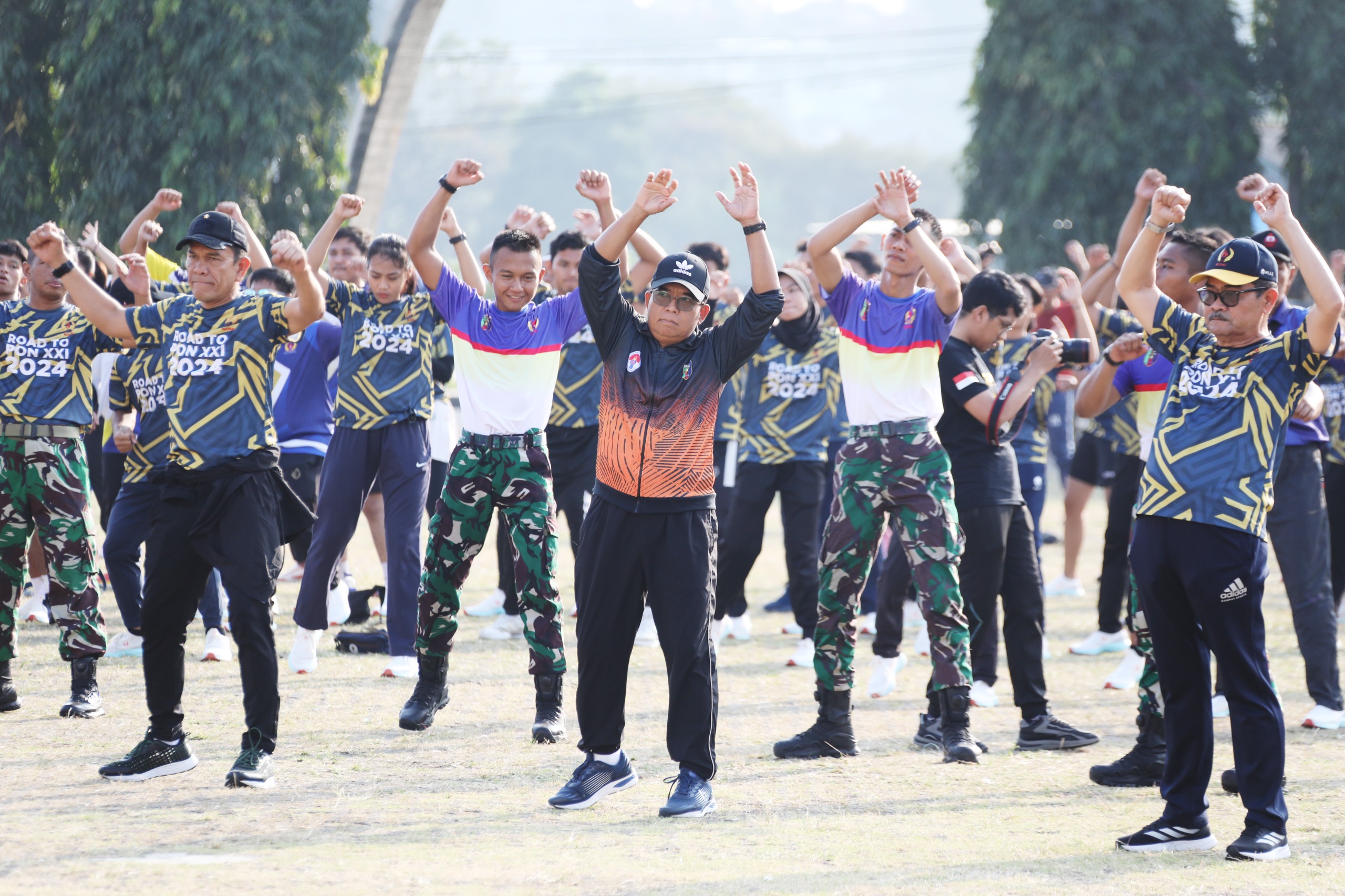 Pj. Gubernur Samsudin dan Ketua Harian KONI Lampung Amalsyah Tarmizi serta Jajaran OPD Pemprov Lampung Melaksanakan Senam Bersama Seluruh Atlet PON Lampung