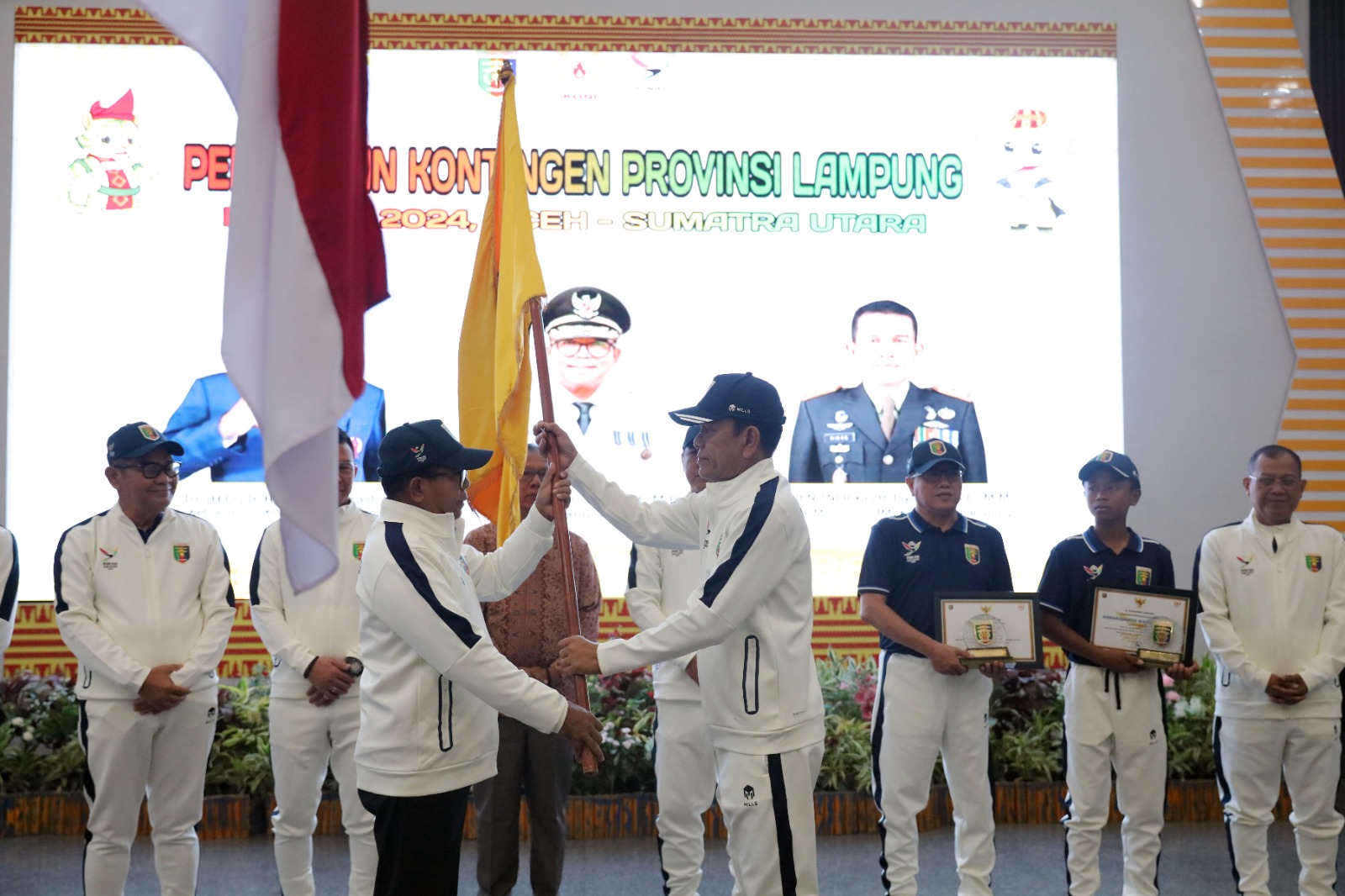 Pelepasan atlet kontingen Lampung ini ditandai dengan penyematan atribut kontingen dan penyerahan bendera pataka oleh Pj. Gubernur Samsudin kepada Ketua Kontingen Lampung Brigjen TNI Rikas Hidayatullah.