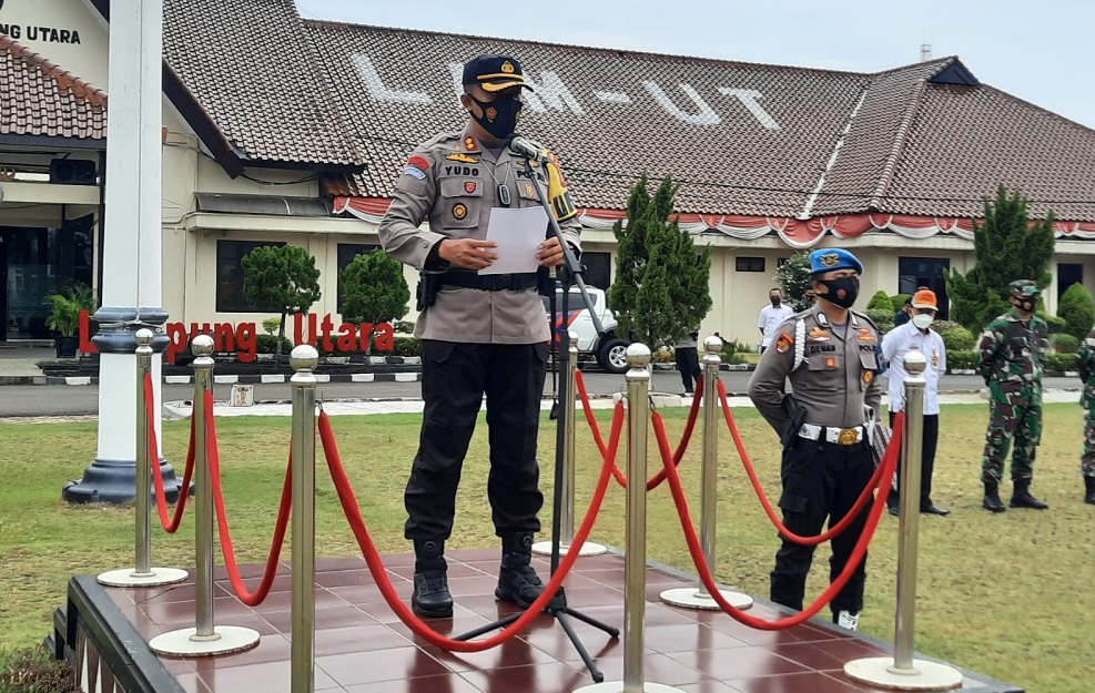 Peserta apel dari personil Polres Lampung Utara, TNI, Satpol PP dan Dinas Kesehatan. Turut hadir pada kegiatan itu Forkopimda, beberapa para Kepala Dinas, pejabat utama Polres dan Kapolsek.