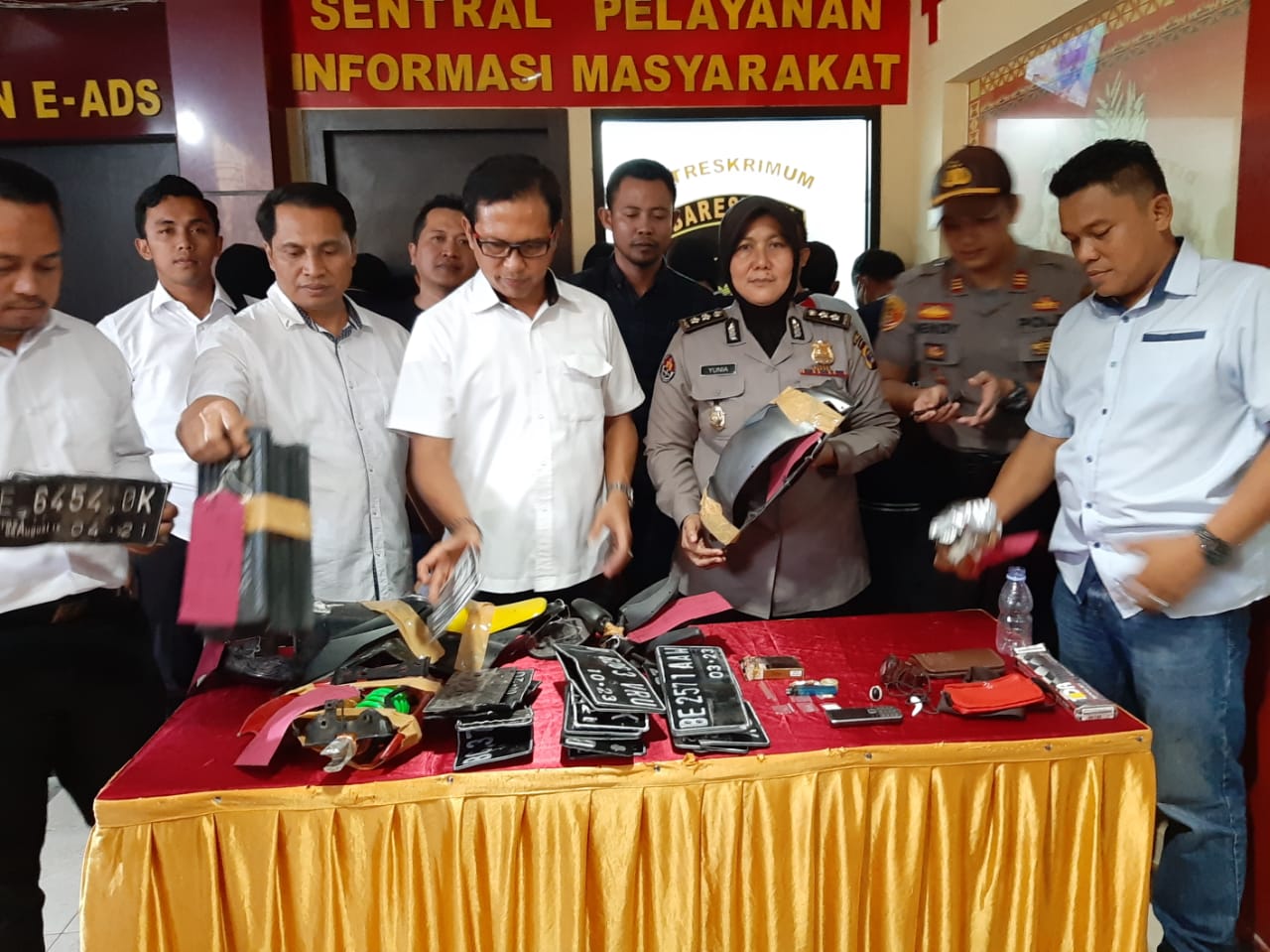 Lanjut Pandra, dari kedelapan pelaku berhasil diamankan barang bukti. Diantaranya, 1 buah kunci letter T, 11 unit R2, 15 pasang plat No Pol R2 , 1 set rumah kunci R2, 4 pasang spion R2, 4 pasang pelindung plat No Pol R2, 1 set rumah kunci R2 belum terpakai, 1 buah kunci jok R2, 1 buah sok R2 variasi, 1 buah behel R2, 1 pasang dudukan kepala R2, dan 1 buah Dasboard R2.