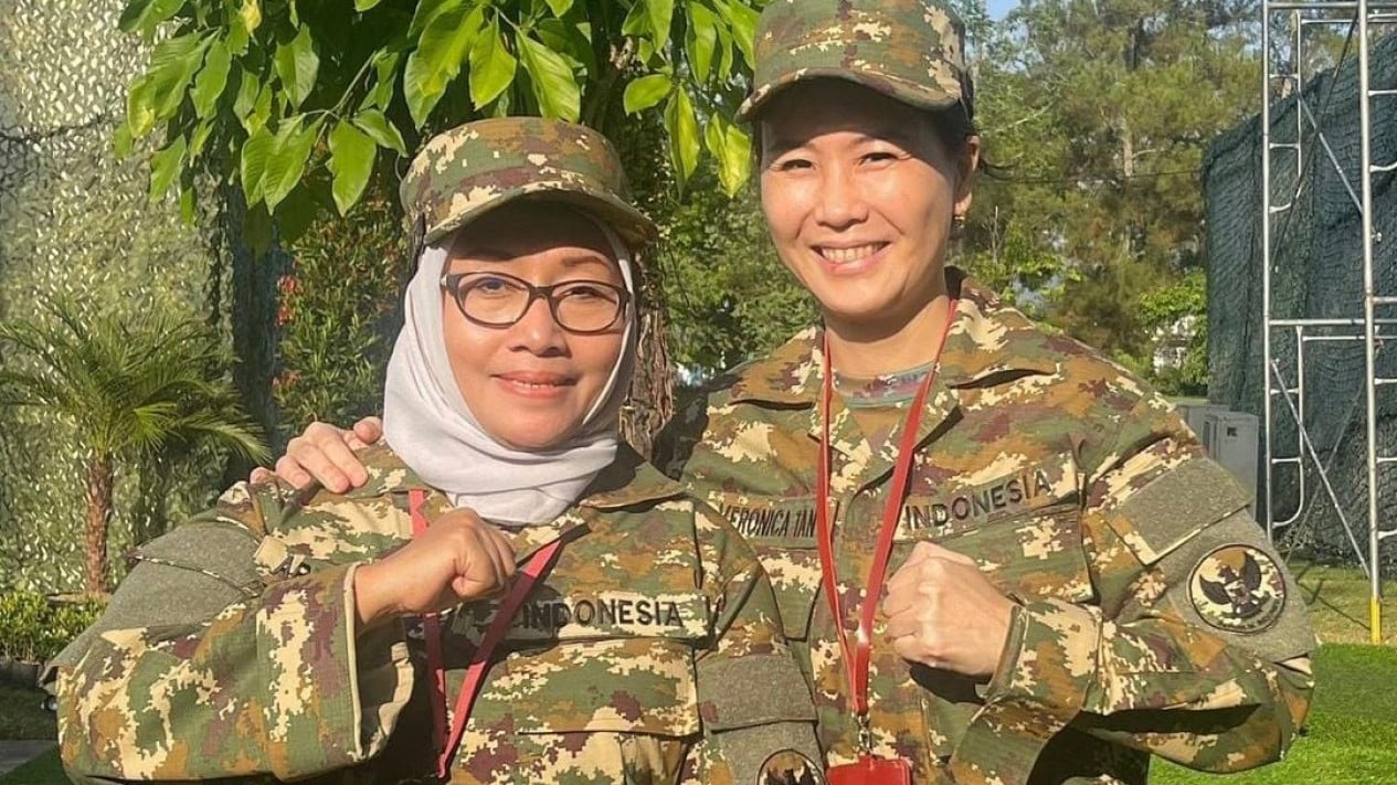 Salah satu momen menarik yang dibagikan Veronica adalah foto dirinya dengan seragam loreng Komcad, lengkap dengan name tag bertuliskan “Veronica Tan” di dada kanan dan “Indonesia” di dada kiri. Ia terlihat berdampingan dengan Menteri PPPA Arifatul Choiri Fauzi, keduanya berpose dengan tangan mengepal, menampilkan simbol persatuan dan tekad untuk memajukan program bagi perempuan dan anak Indonesia.