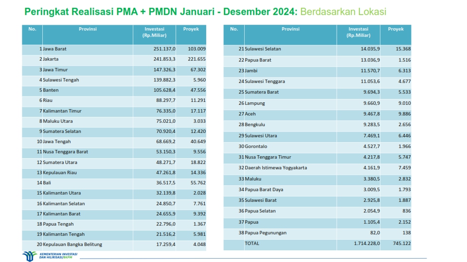 Secara keseluruhan, Jawa Barat menjadi provinsi dengan realisasi investasi tertinggi mencapai Rp251,1 triliun, diikuti Jakarta Rp241,8 triliun, dan Jawa Timur Rp92,4 triliun. Riau dan Kalimantan Timur menyusul dengan Rp61 triliun dan Rp55 triliun.