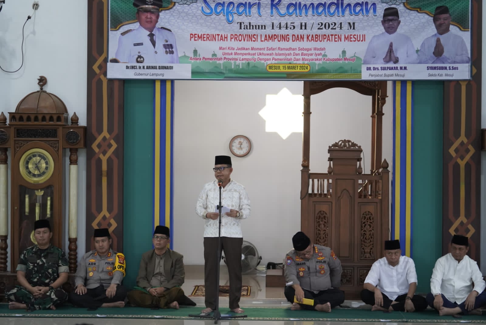 GANTANEWS.CO, MESUJI —  Penjabat Bupati Mesuji Dr. Drs. Sulpakar, M.M. menghadiri kegiatan Safari Ramadan Provinsi Lampung tahun 1445 Hijriah di Masjid Agung Darussalam, Desa Mulya Agung, Kecamatan Simpang Pematang, Kabupaten Mesuji, Jumat (15/03/2024).