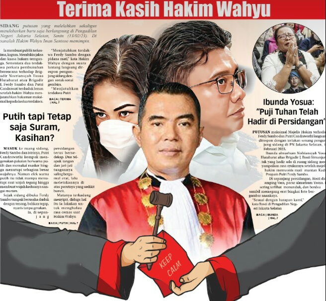 PUTUSAN maksimal Majelis Hakim terhadap Ferdy Sambo dan Putri Candrawathi langsung direspon dengan teriakan senang pengunjung sidang di PN Jakarta Selatan, 13 Februari 2023. Ibunda almarhum Nofriansyah Yosua Hutabarat alias Brigadir J, Rosti Simanjuntak yang hadir ada di ruang sidang menyampaikan rasa syukurnya setelah majelis hakim memvonis mati mantan Kadiv Propam Polri Ferdy Sambo. Di sepanjang persidangan, Rosti didamping Vera, pacar almarhum Yosuo. Ia sering terlihat menunduk, dan berdoa sambil memegang erat bingkai foto bergambar ananknya. "Sesuai dengan harapan kami," kata Rosti di Pengadilan Negeri Jakarta Selatan usai Ferdy Sambo divonis mati, Senin 13 Februari 2023. Menurut dia, Tuhan telah hadir di persidangan. "Puji Tuhan, tetesan darah anak ku yang bergelimang, Tuhan nyata telah menyatakan keajaibannya," ujar dia. Rosti juga mengucapkan terima kasih kepada awak media yang selama ini menyampaikan pemberitaan kasus pembunuhan Yosua kepada publik. "Terima kasih, media selalu mendukung kami upload ini semua peristiwa pembunuhan kasus terhadap almarhum Yosua," ujarnya. Kemudian, Rosti berharap agar majelis hakim Pengadilan Negeri Jakarta Selatan menjatuhkan hukuman maksimal terhadap terdakwa lainnya. "Semoga menyatakan hukuman yang maksimal kepada terdakwa Pasal 340 pembunuhan berencana karena mereka mengetahui pembunuhan, menginginkan kematian anak ku Yosua," ucap Rosti. Menteri Koordinator Politik Hukum dan Keamanan Mahfud Md pun ikut buka suara terkait vonis mati untuk Ferdy Sambo. Mahfud mengatakan vonis itu sesuai dengan rasa keadilan publik. “Vonisnya sesuai dengan rasa keadilan publik, Sambo dijatuhi hukuman hati,” kata Mahfud lewat akun Twitternya, @mohmahfudmd, Senin, 13 Februari 2023. Mahfud berpendapat vonis itu dijatuhkan bukan tanpa alasan. Dia menilai peristiwa pembunuhan berencana terhadap Brigadir Nofriansyah Yosua Hutabarat tergolong kejam. Pembuktian yang dilakukan jaksa penuntut umum, kata dia, nyaris sempurna. “Peristiwanya memang pembunuhan berencana yang kejam. Pembuktian oleh jaksa penuntut umum memang nyaris sempurna,” kata dia. Mahfud juga mengapresiasi para majelis hakim yang menyidangkan Sambo. Dia berujar para hakim telah bekerja dengan baik dan independen. “Hakimnya bagus, independen, dan tanpa beban,” kata Mahfud. Namun Komisi untuk Orang Hilang dan Korban Tindak Kekerasan (KontraS) mengkritik hukuman mati yang dijatuhkan kepada Ferdy Sambo. KontraS menyatakan vonis itu tidak sesuai dengan semangat moratorium terhadap eksekusi mati sejak 2016. "Pemberlakuan vonis mati tidak sejalan dengan semangat moratorium terhadap eksekusi mati,” kata Koordinator KontraS Fatia Maulidiyanti, Senin, 13 Februari 2023. Menurut Fatia, moratorium hukuman mati itu memang belum secara tertulis diteken oleh pemerintah. Namun, secara fakta sejak 2017 hukuman mati belum pernah lagi diterapkan di Indonesia. Fatia mengatakan kritik KontraS ini tidak hanya berlaku untuk kasus Sambo. Sehingga KontraS, kata dia, menolak semua hukuman mati kepada siapa pun. “Penting untuk melihat bahwa penghapusan hukuman mati bukan berarti mendukung tindakan kriminal,” ujar dia.(*/iwa)