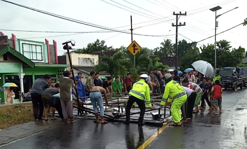 Petugas Gabungan Dibantu Warga Evakuasi Baliho Tumbang di Jalinbar Pugung