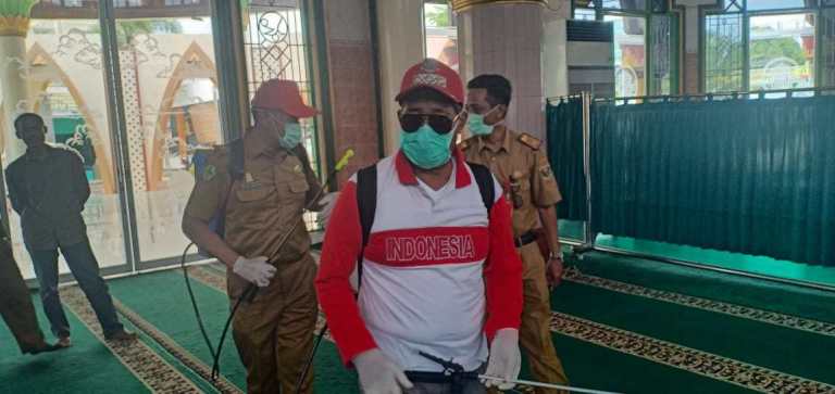 Antisipasi Corona, Bupati Lamteng “Semprot” Masjid Istiqlal Pakai Cairan Disinfektan