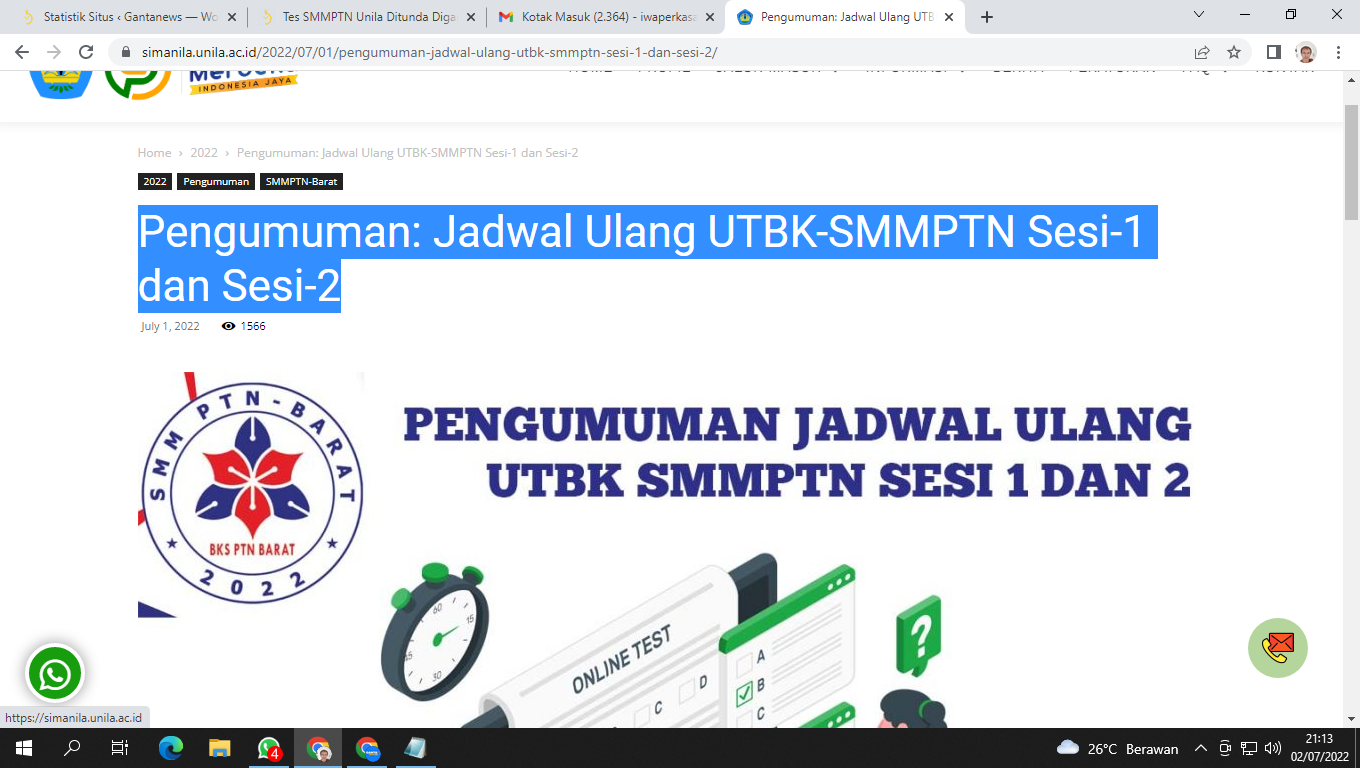 Sempat Ditunda, Ini Pengumuman Jadwal Ulang UTBK-SMMPTN Sesi-1 dan 2 Unila