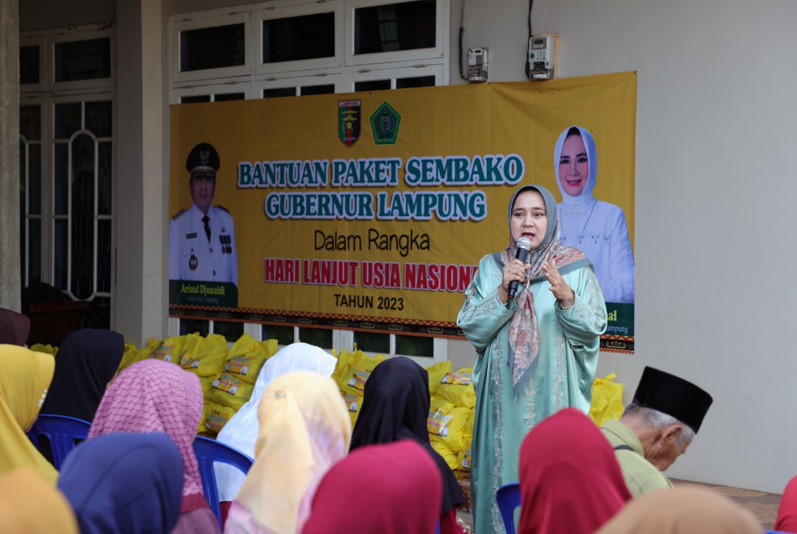 Ketua Umum LKKS Provinsi Lampung Ibu Riana Sari Arinal Serahkan Bantuan Sembako kepada Masyarakat Desa Jati Mulyo