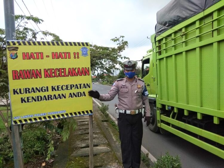 Cegah Kecelakaan, Satlantas Polres Tanggamus Pasang Banner Himbauan di Jalinbar Gisting