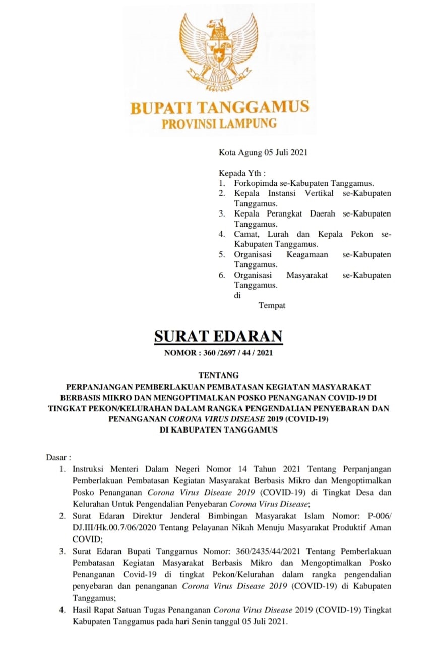 Bupati Tanggamus Keluarkan Edaran PPKM Mikro, Hajatan Dilarang dan Tempat Wisata Ditutup