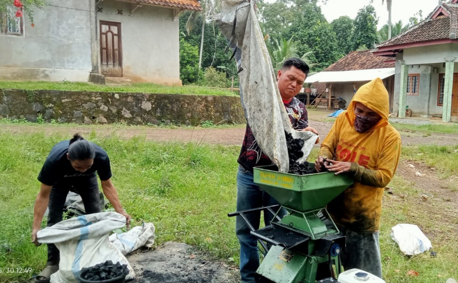 GANTANEWS.CO, TANGGAMUS — Ketua Tanggamus Peduli, Dedi Suparman  mendampingi Kelompok Tani dan Tim Peneliti dari Universitas Lampung (Unila), Rusdi Evizal, Dosen Bidang Pertanian dan Perkebunan membuat Biochar (arang) guna memperbaiki unsur tanah pertanian di Pekon Sidomulyo, Kecamatan Air Naningan, Senin (30/5/2022).
