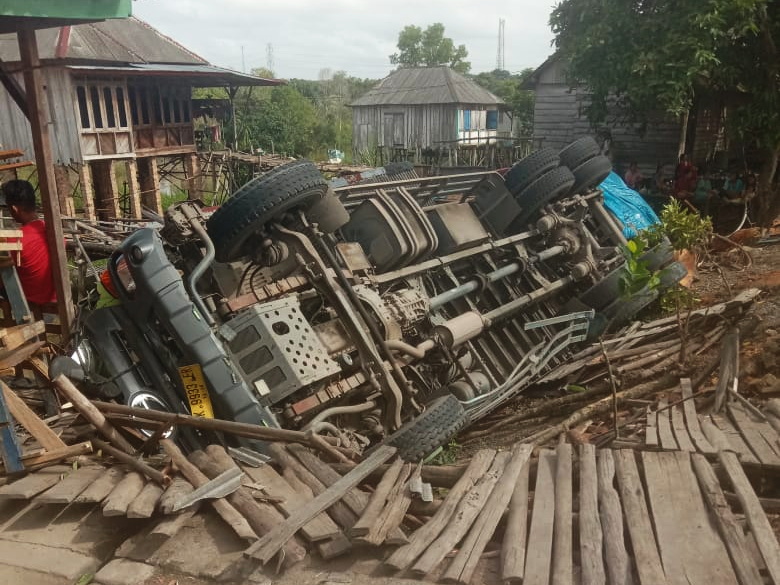 Truk dengan plat nomor BK 9933 ER tersebut terguling sekitar pukul 03.30 WIB saat melaju di Jalan Lintas Timur Desa Labuhan Permai. Muatan telur yang berat diduga menjadi penyebab truk terguling dan menimpa rumah warga.